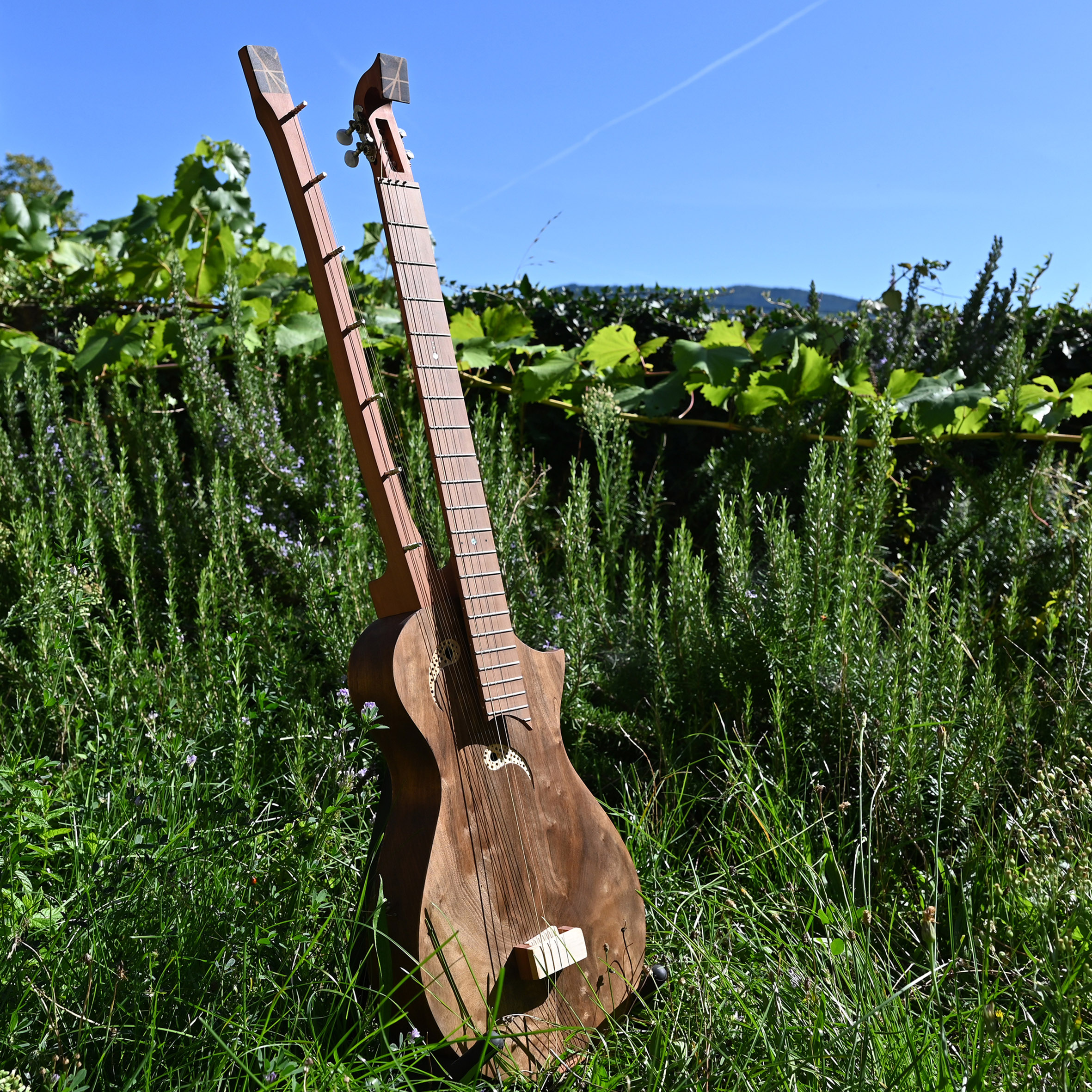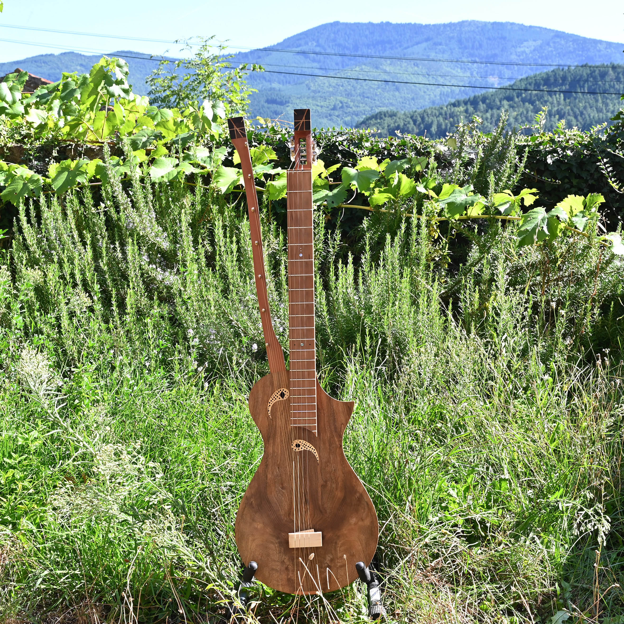 Table d’harmonie en noyer, monoxyle de tilleul, fond érable, manche alisier, touche en cormier, micro interne.
