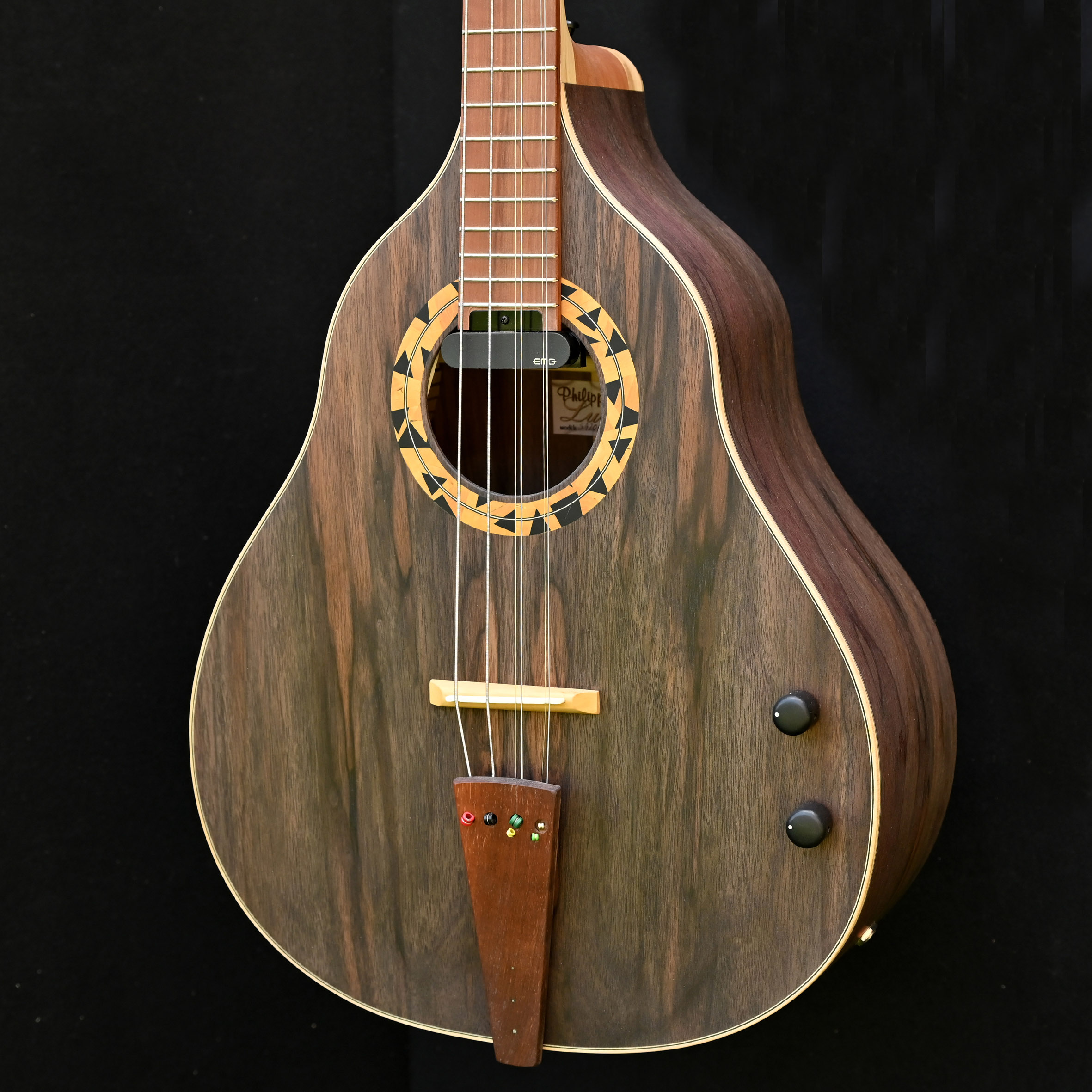 Octave electroacoustic bouzouki GDAE with octaves strings: 4 bass strings combined with 4 guitar strings for a “natural” octave effect by simply playing on the feel of the strings, a deliberately exaggerated body thickness to reach the sub-bass, this sazouk bass is the latest of the workshop’s bouzouki family.