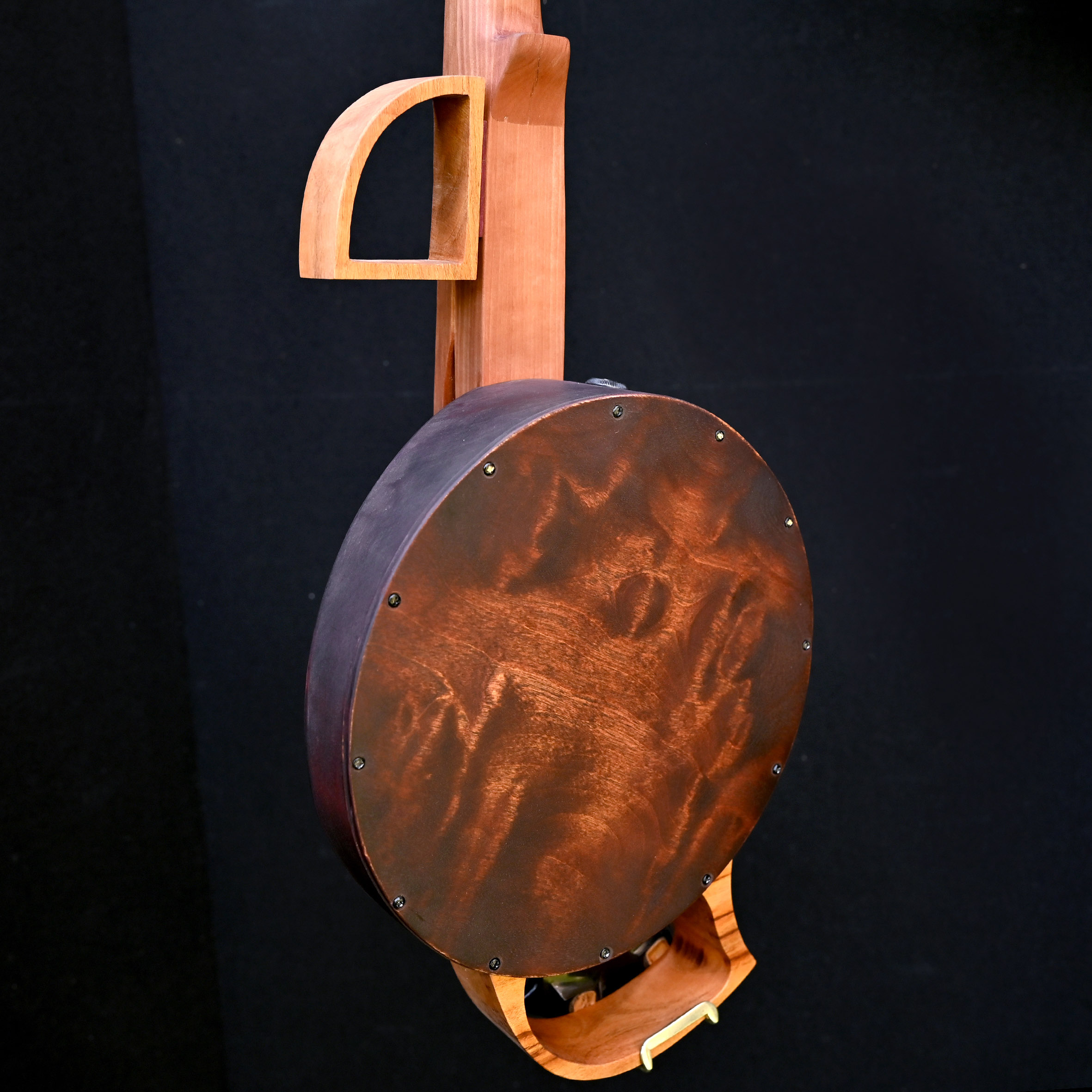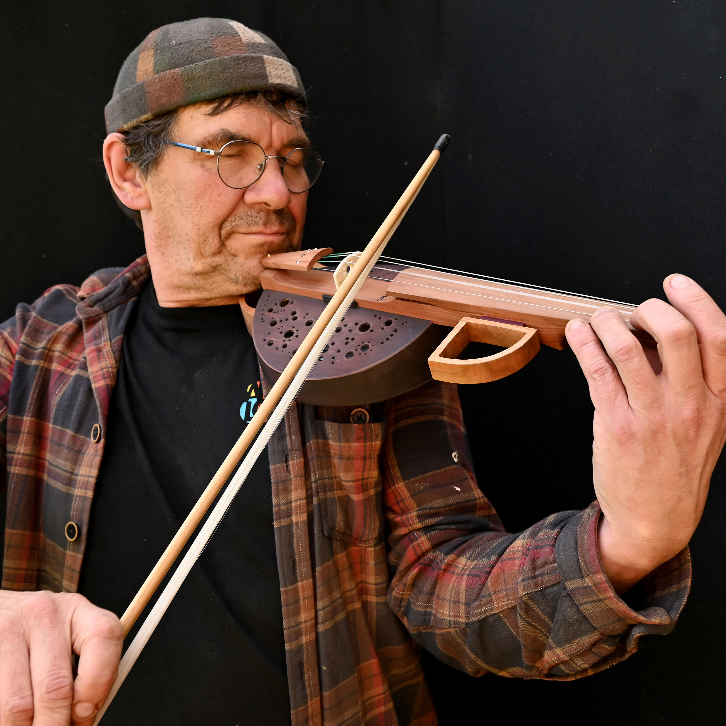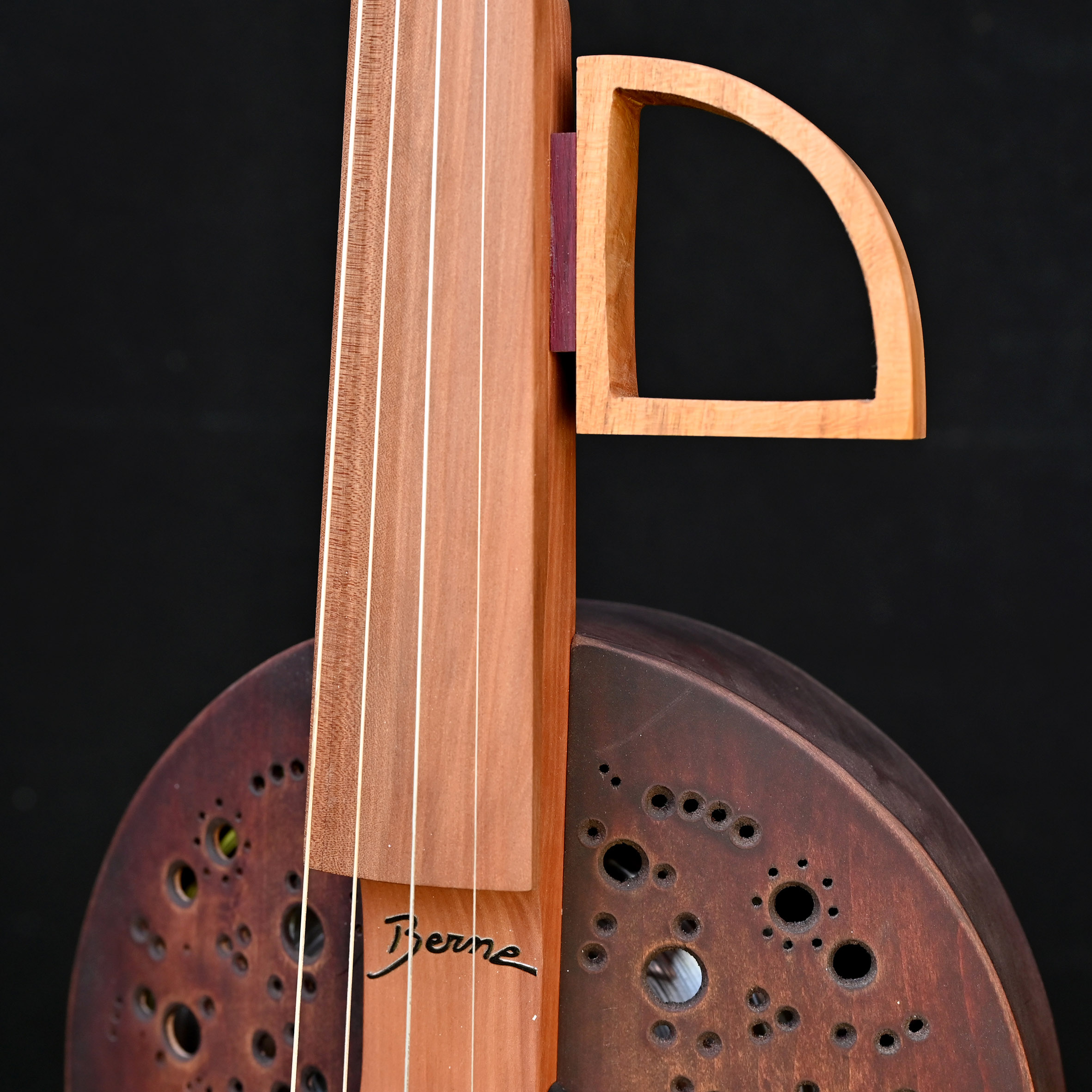 4 playing strings + 7 sympathetic strings, basswood monoxyl, larch and walnut resonator, hornbeam neck, sorb fingerboard, plane tree tailpiece, integrated piezo pickup.